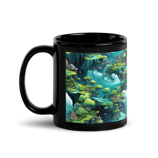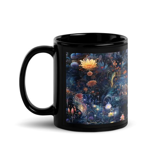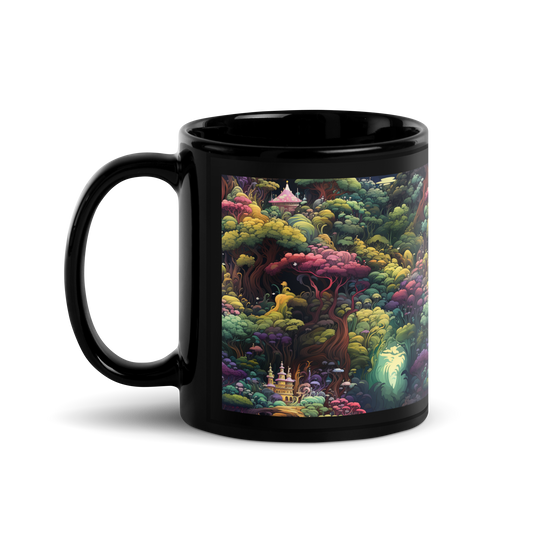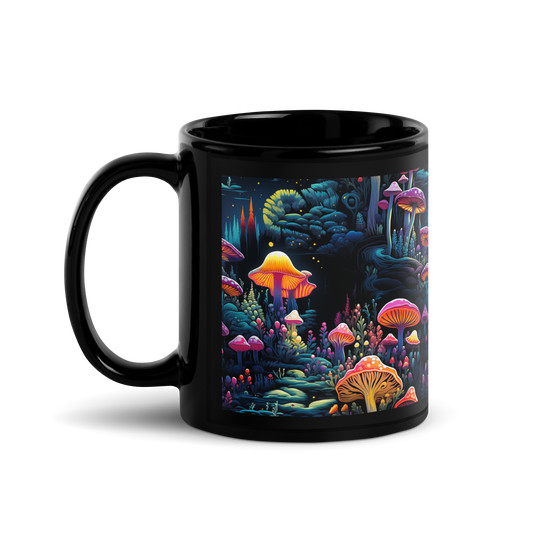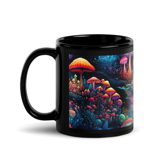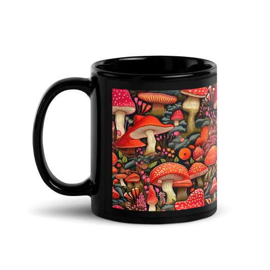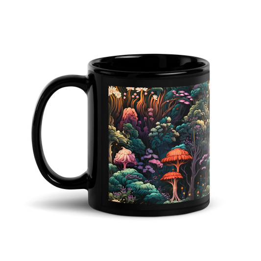 Mystical Mushroom Wonderland: Enchanting Black Coffee Mug Design